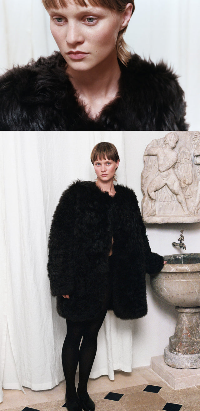 Un traje oversize tomado del armario masculino se combina con un vestido bustier de lana de líneas depuradas. La piel de lana abriga el cuerpo, los cueros brillan en un verde oliva intenso o en negro lacado. El punto fino se desliza suavemente sobre la piel. Los zapatos de tacón Théa en color marfil, el bolso Suzanna en charol y el pañuelo de seda plisado completan este look sofisticado y sobrio.
