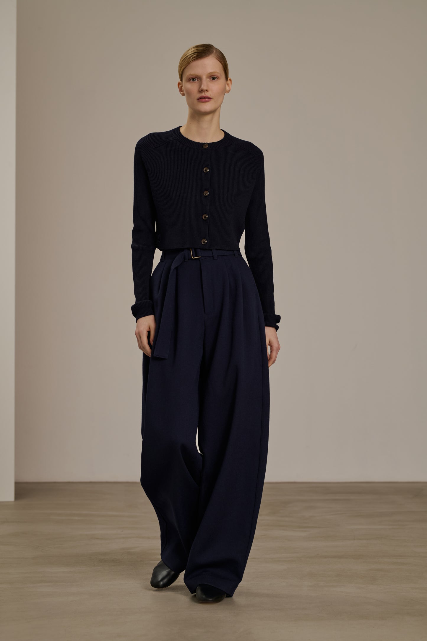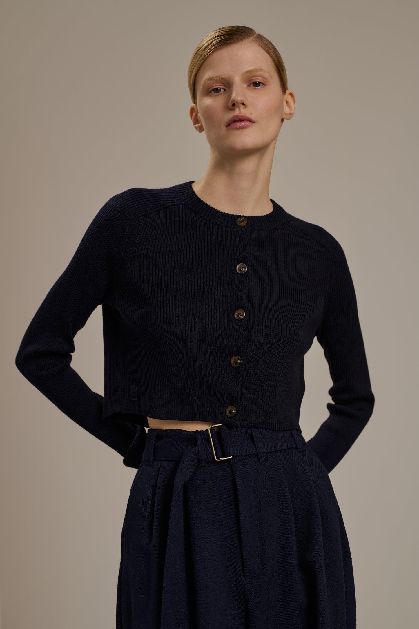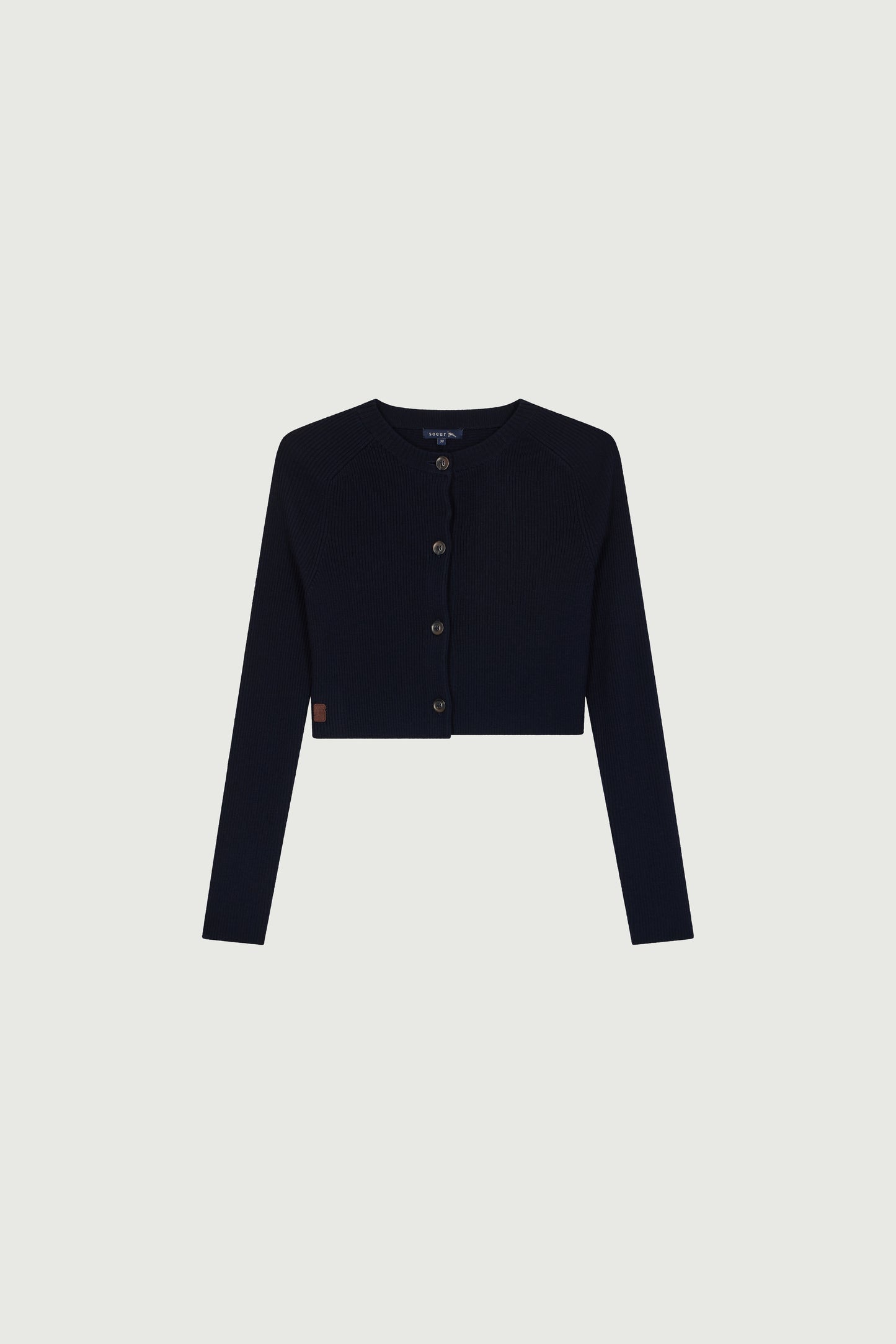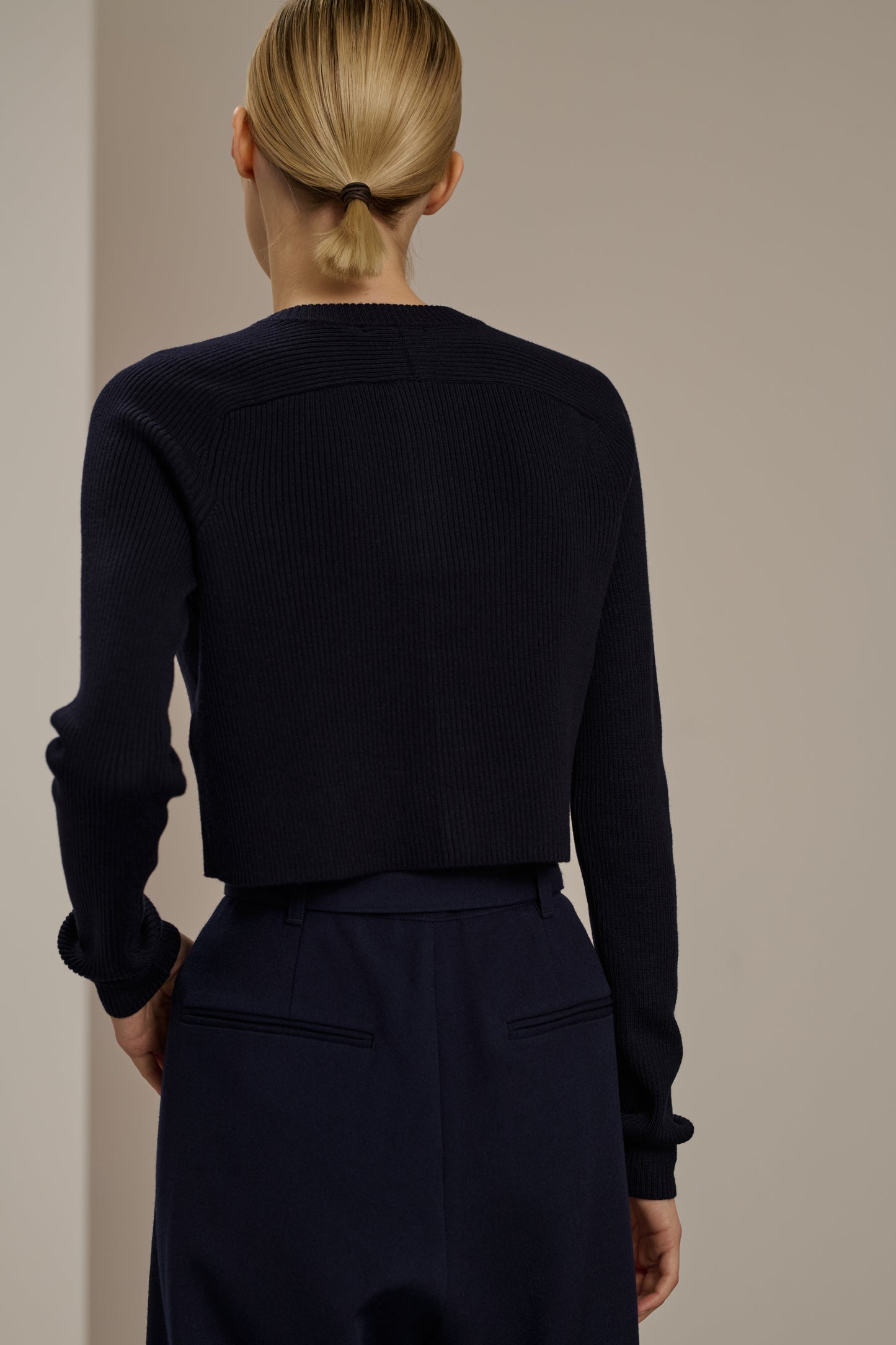 Cárdigan corto de punto de canalé de lana merina azul marino