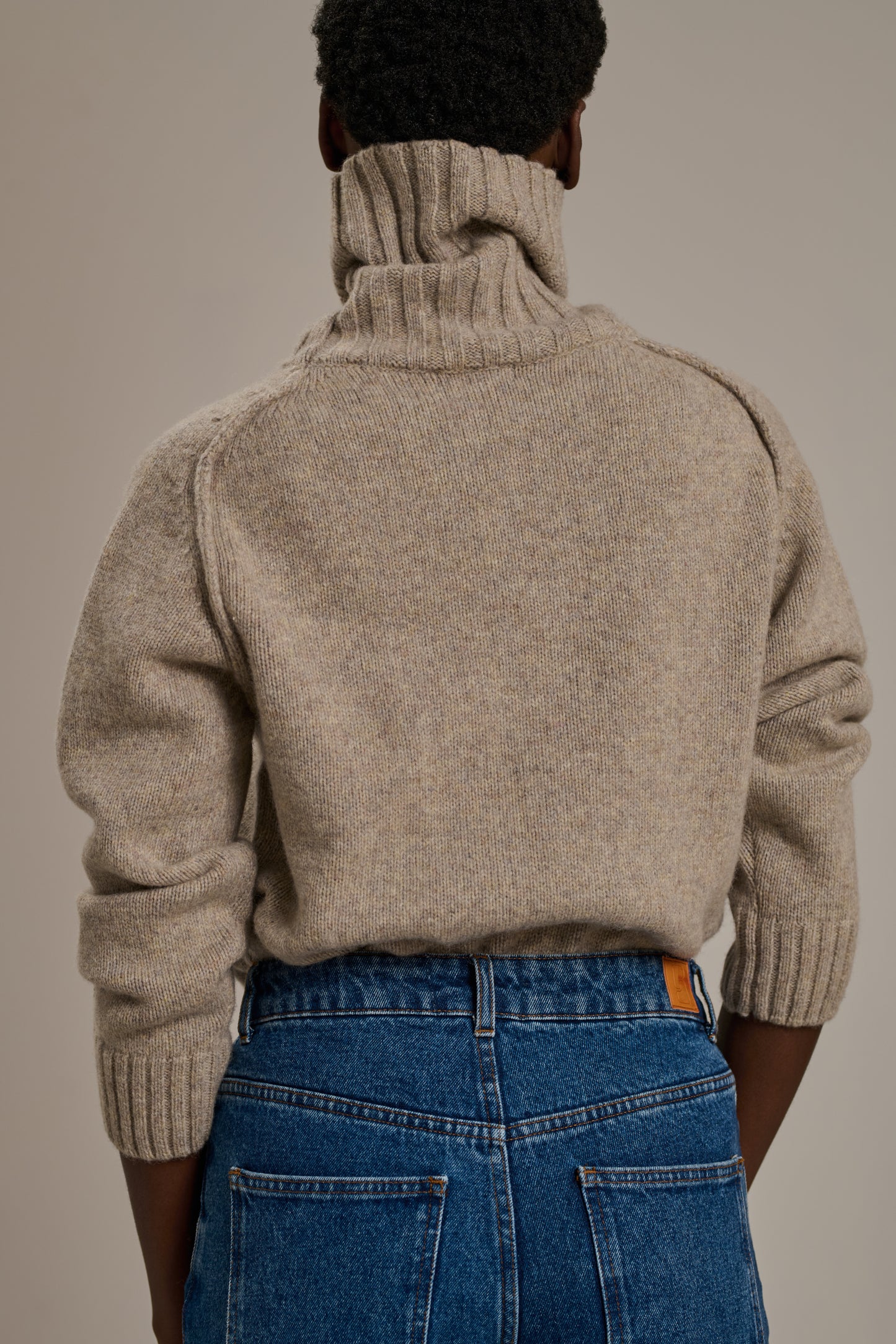 WINDY es un jersey de cuello alto en lana mezclada. Las costuras vueltas destacan la sisa martillo. Su cuello de canalé ha sido intencionadamente alargado para darle un aire singular. Posibilidad de enrollar o doblar el cuello según se desee. Su volumen corto y ajustado al cuerpo permitirá meterlo fácilmente en un pantalón.