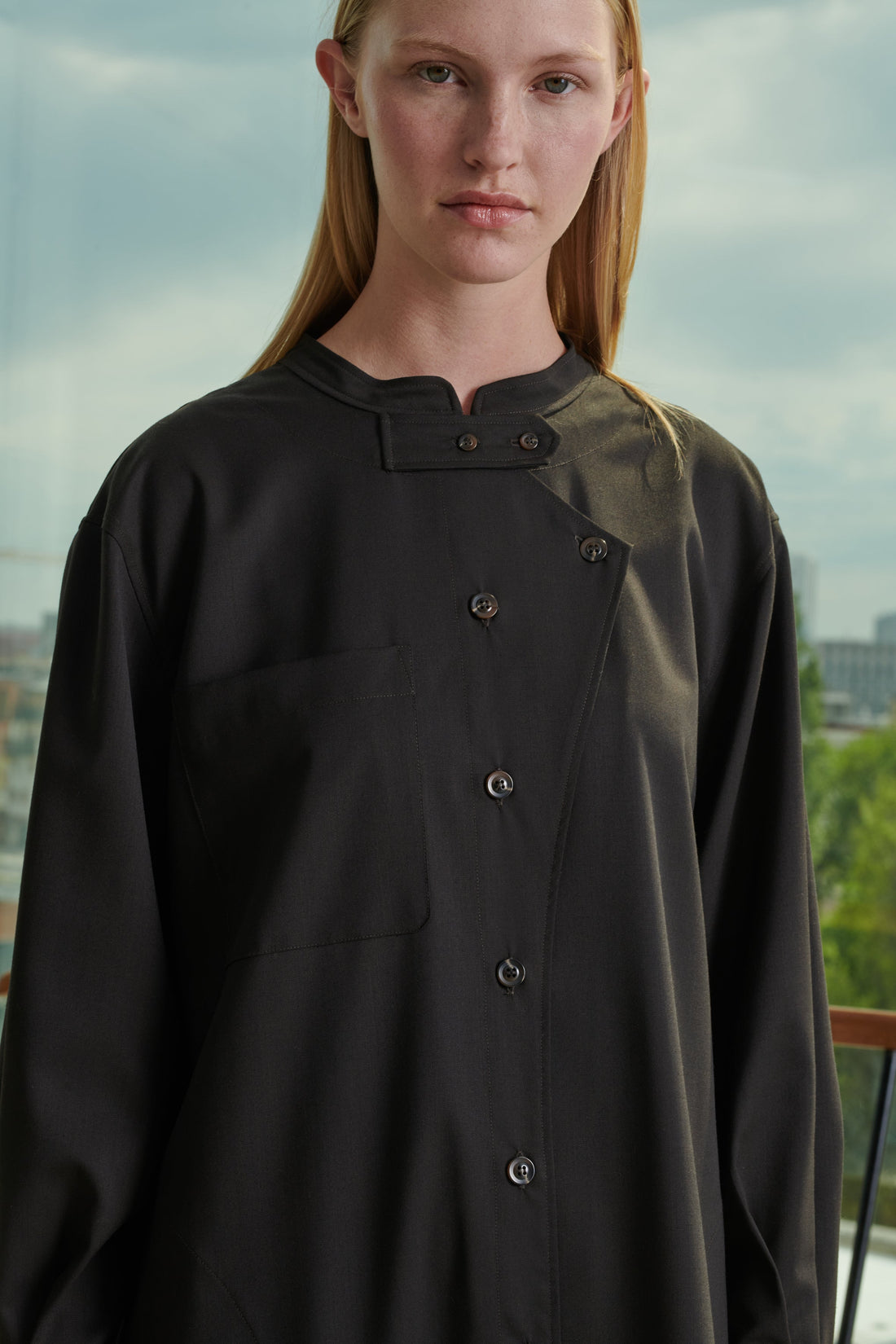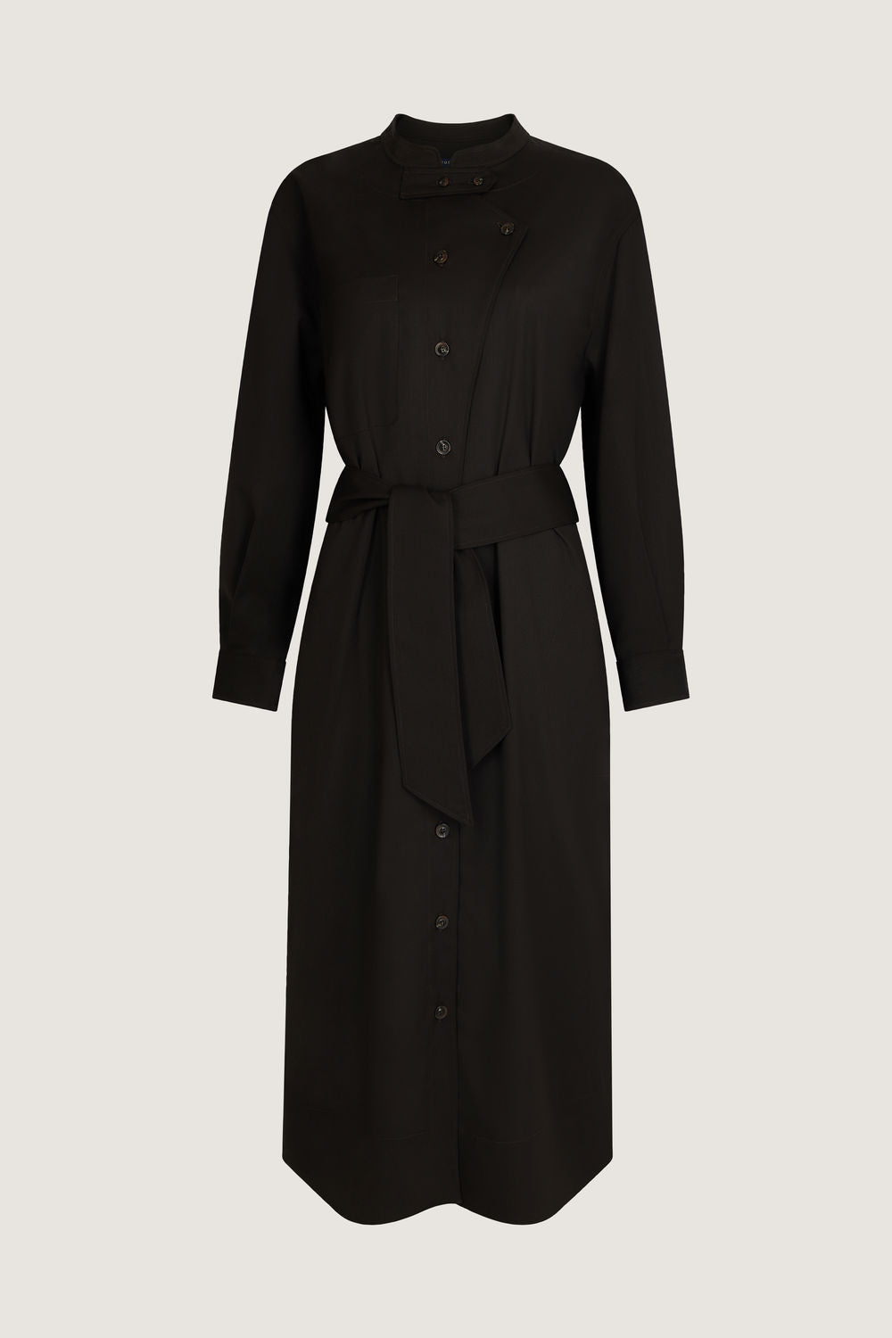 Vestido de gabardina de lana ligera - Vestido largo y volumen recto, se puede llevar con o sin cinturón- Escote redondo- Abertura abotonada asimétrica delante- Tira de ajuste en el escote- Manga larga con puño de camisa abotonado- Un bolsillo de parche en el pecho- Bolsillos insertados en las costuras laterales
